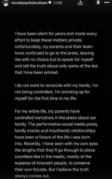 据悉,前段本领布鲁克林发长文公开控诉亲生父母,责怪父母操控他的生涯,并明确暗示“不思与家东谈主息争”。