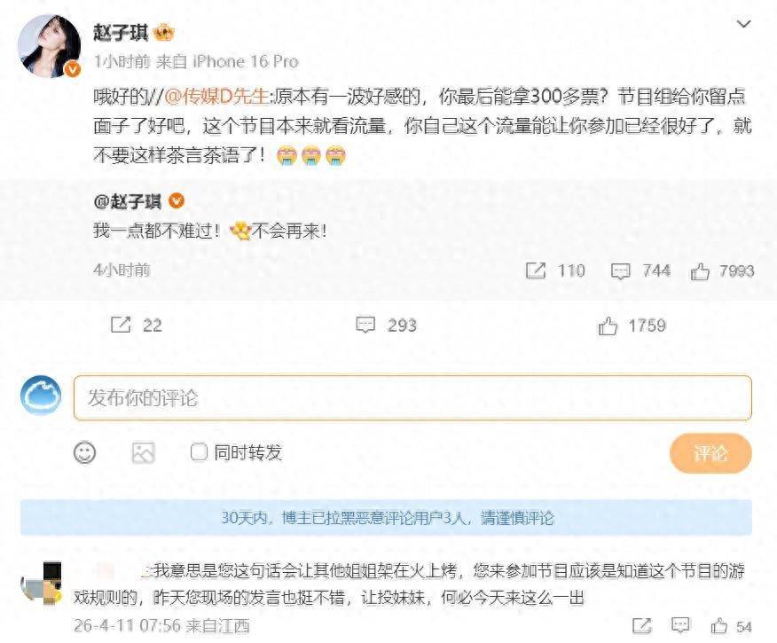 4月11日凌晨,《乘风2026》姐姐赵子琪发文:“我极少皆不酸心!不会再来!”