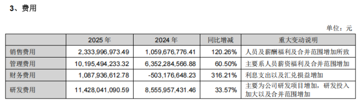 2025年,公司研发过问达114.28亿元,同比增长33.57%;销售用度、经管用度及财务用度同比永诀增多120.20%、60.50%和316.21%,均远超营收增速。其中,财务用度激增主要受利息开销与汇兑损益增多影响,对公司利润变成昭彰侵蚀。