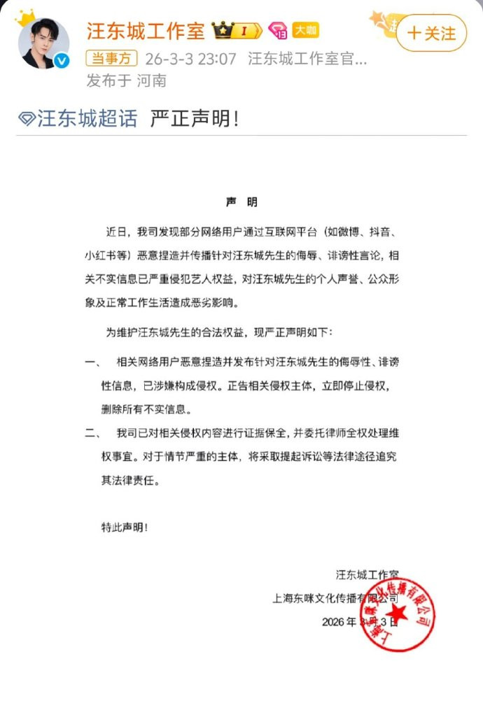 3月4日下昼,汪东城使命室通过官方微博发布声明,指出近期部分汇集用户不绝辩认对于汪东城先生的“伪善言论”,包括“坏心执造的私东谈主心情生计”“无端接头的买卖相助内幕”等,已严重侵略其名誉权。声明明确示意:“已录用讼师对相干侵权言论进行凭证保全,并将照章根究法律背负。”