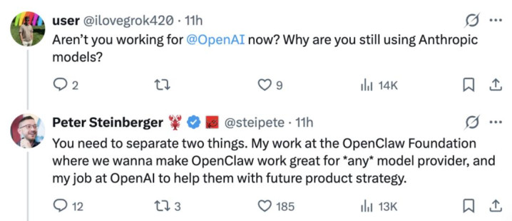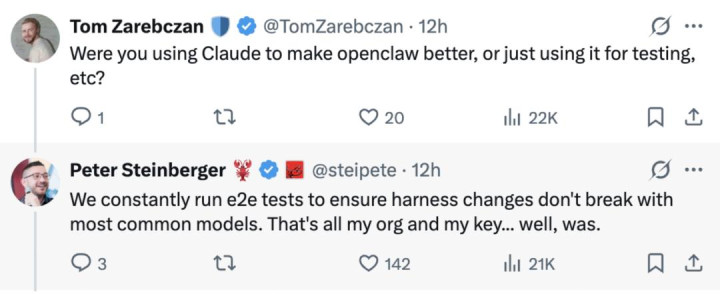 今天一大早,OpenClaw 创举东谈主 Peter Steinberger 就在 X 上发文:「是的,诸君,异日要确保 OpenClaw 陆续与 Anthropic 模子兼容将会愈加用功。」