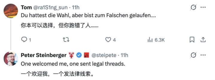 Peter Steinberger 亦然绝不夷犹地反击:「他们一个宥恕我,一个发法律函……」