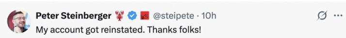 但「封禁」工夫莫得无间太久,只是两个小时后,Peter Steinberger 再次发文:「我的账号被还原了,谢谢公共!」