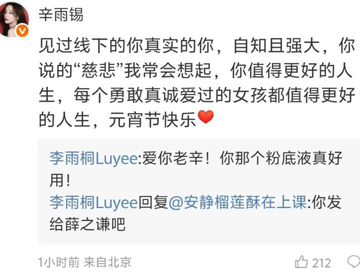一经锤过渣男男星的辛雨锡发有计划力挺李雨桐,在她的社媒下面用了好几个词传颂她,说她很很和睦、有劲量,值得更好的东谈主。